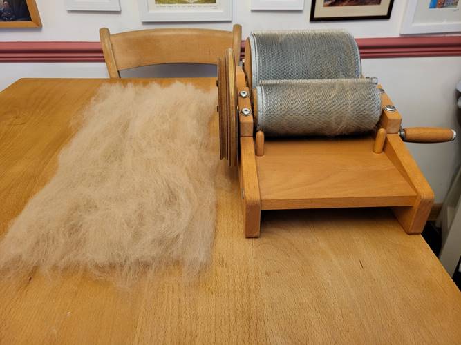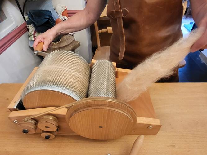 Locks of fleece are then fed into the drum carder to make batts of fibre ready for spinning.