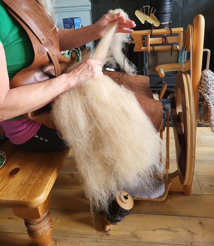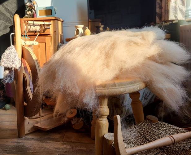 Sort and skirt the fleece - remove any rough fibres or any rough guard hairs, so that only the best, softest, finest fleece is left, and pick out any remaining vegetable matter - leaves, twigs, etc.
