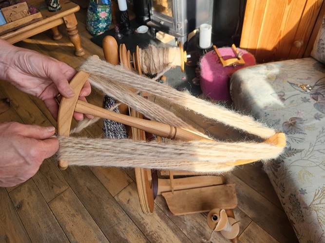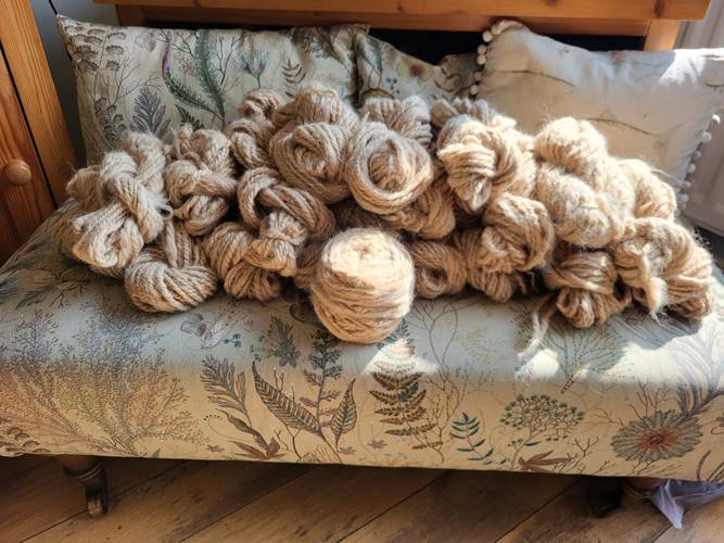 The off-white yarn comes from Willow who is older and therefore does not have a fleece as soft as a younger animal.