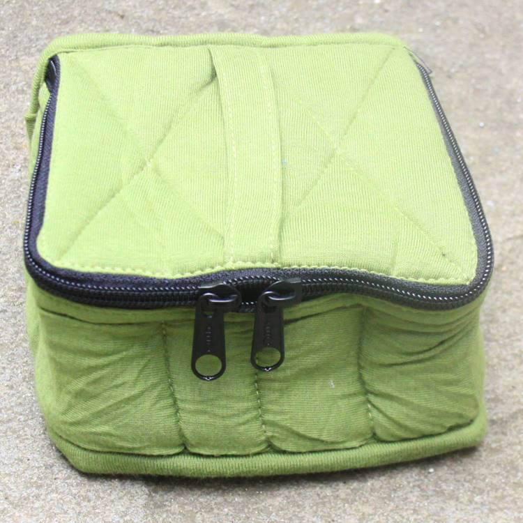 The exterior fabric is a strong polyester which gives the bag a firm and sturdy feel. The interior is cotton jersey with foam padding in the walls. The bottles are held tightly together by a padded grid in the same cotton as the interior. They are prevented from rattling as they would against the walls of a conventional wooden box.
